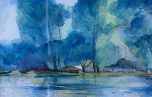 TABLEAU PEINTURE gouache rivière orge villiers sur orge 91 - au bord de l'orge à Villiers sur orge