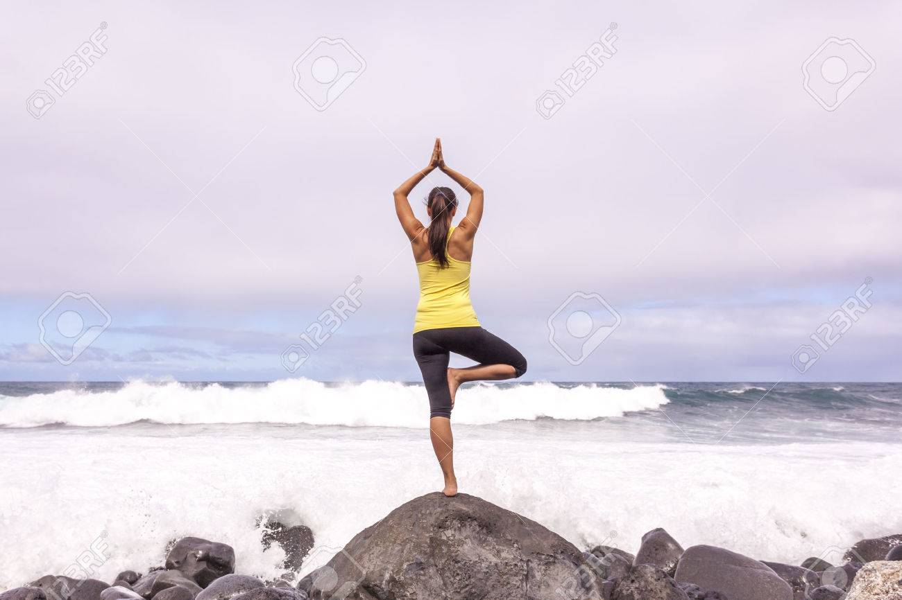 Junge Frau Praktizieren Yoga Pose Baum In Der Nähe Des Ozeans Bei Sonnenuntergang Lizenzfreie Fotos, Bilder Und Stock Fotografie. Image 25585575.