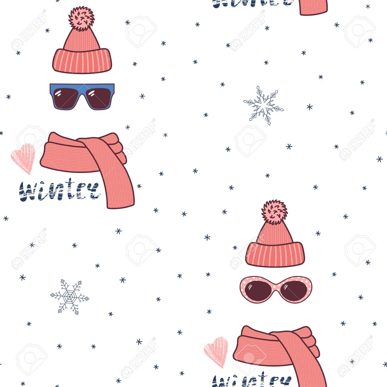 暖かい面白いニット帽子、サングラス、マフラー、冬、雪の結晶の白い背景の上の心のテキストと手描きのシームレスな背景パターン。デザイン コンセプトの冬 、子供繊維印刷、包装紙。のイラスト素材・ベクタ - Image 90321585.